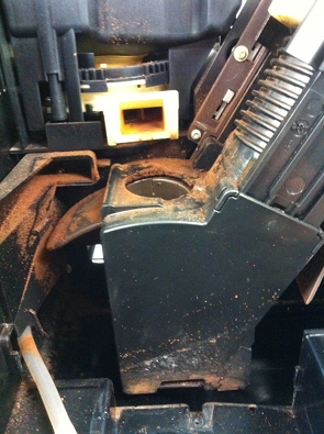 Innenreinigung des Gehäuses. Da sich erfahrungsgemäß im Inneren eines Kaffeevollautomaten immer Reste von gemahlenem Kaffee befinden, wird das Gehäuse mit Druckluft ausgeblasen. Dadurch wird vermieden, dass sich diese Reste von Kaffeepulver in Verbindung mit eventuell auftretenden Undichtigkeiten zu einer hartnäckigen Ablagerung im Gehäuseinneren verdichten.